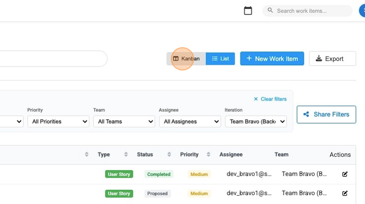 On the kanban board, you can drag and drop work items between columns to update their status.